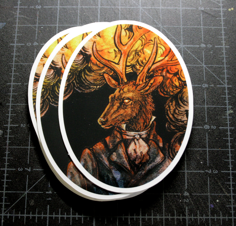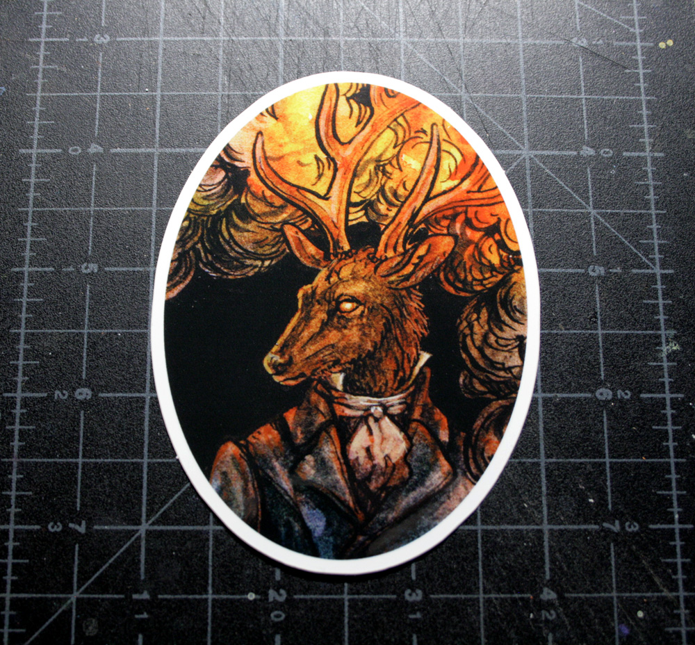 Oval shaped vinyl sticker (approx. 4"x3") of a well dressed elk.
