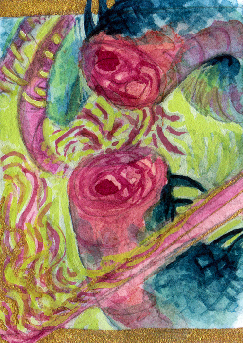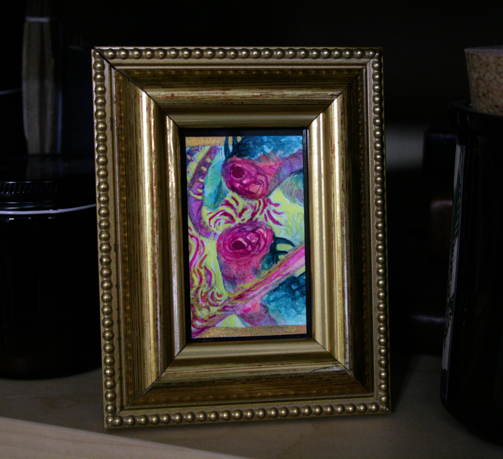 Framed miniature (approx 1" x 2") watercolor/gouache painting of a serpentine beast being slain.