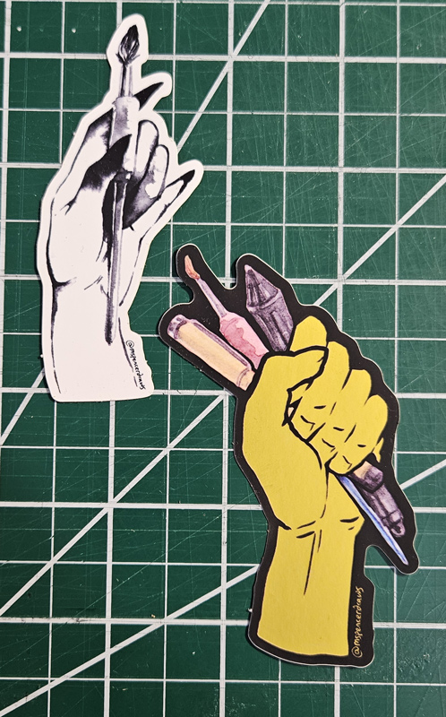 Stickers are vinyl. Gold hand has a matte metalic finish.